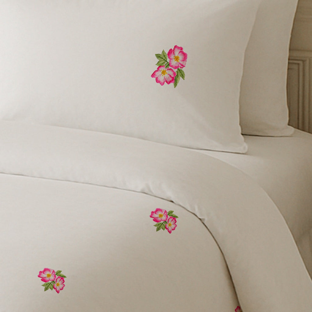 The Rose Reverie collection features fine floral embroidery, thoughtfully placed to maintain a clean, elegant look rather than an overly busy design. Each embroidered motif is carefully stitched to achieve a refined and narrow pattern layout, enhancing the bedding’s sophisticated appeal. The subtle embroidery adds texture and depth while preserving a light, airy feel—perfect for those who appreciate understated luxury.