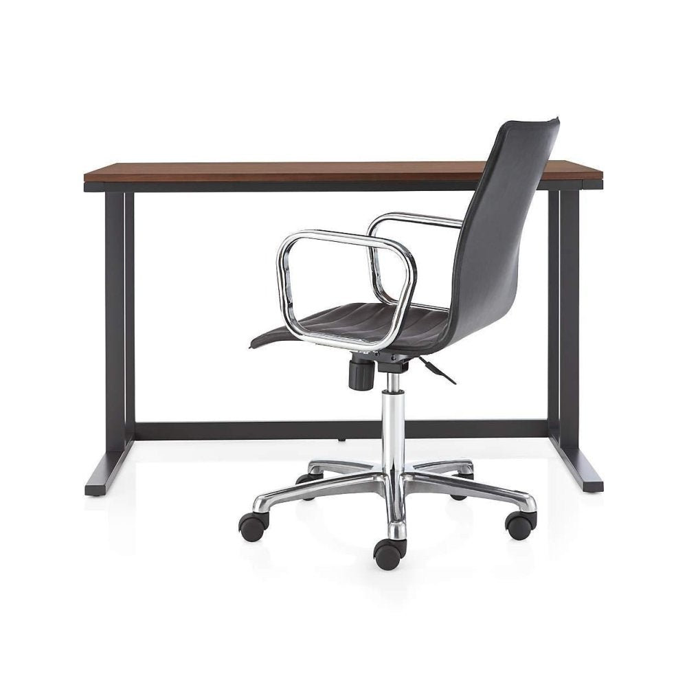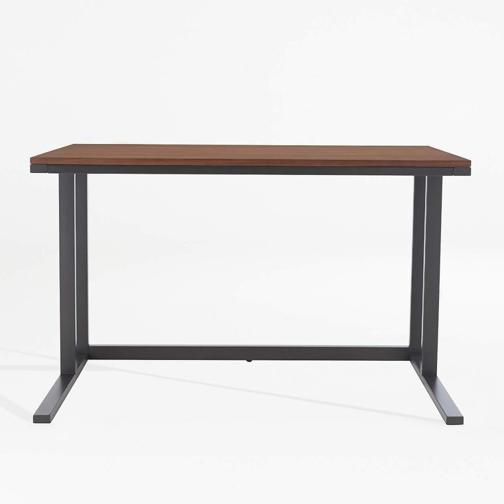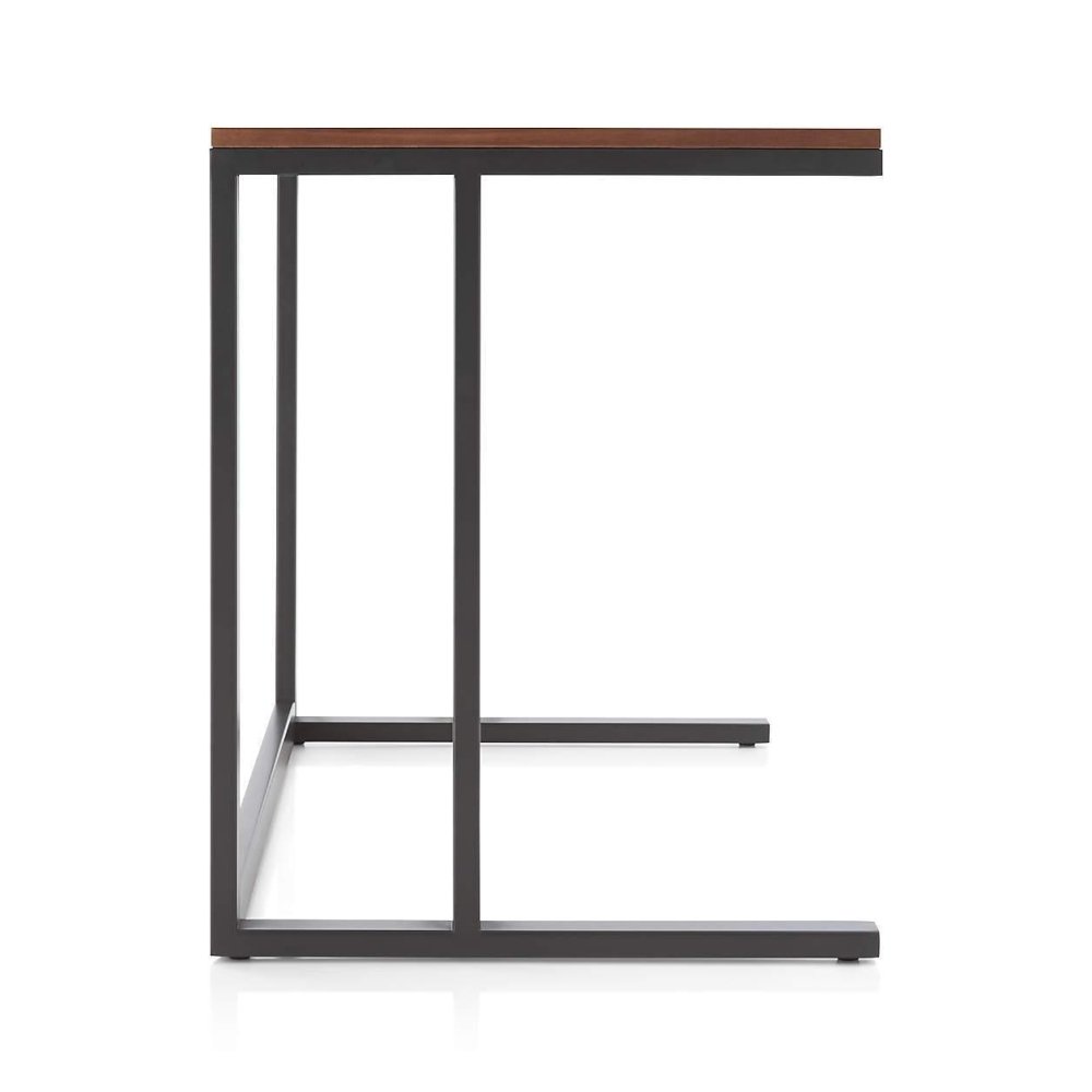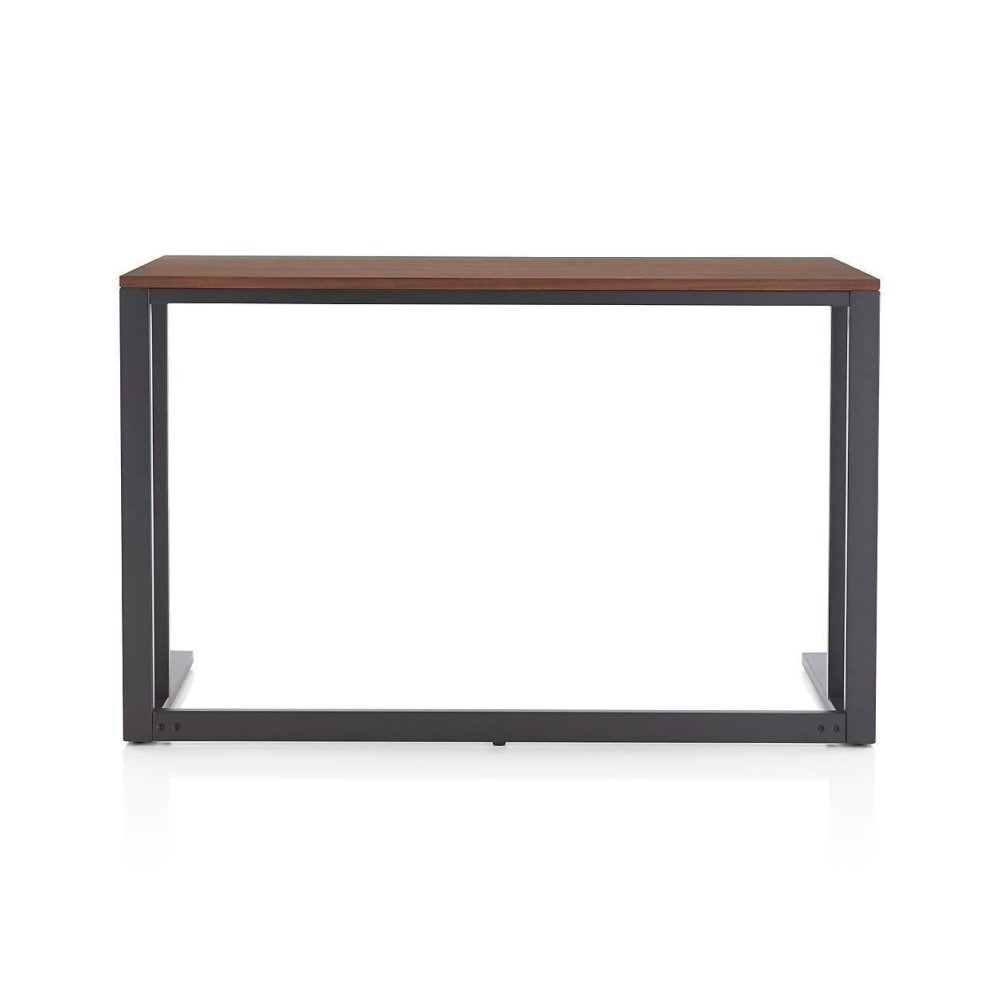 A warm walnut veneer desktop floats over a minimalist yet durable frame of rectangular iron tubing finished in sleek grey powder coat.