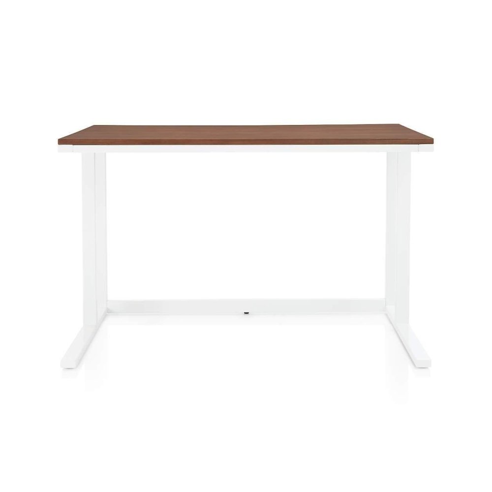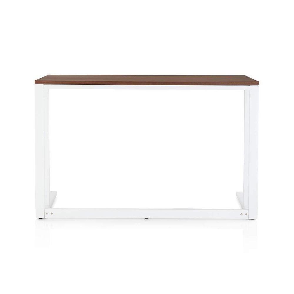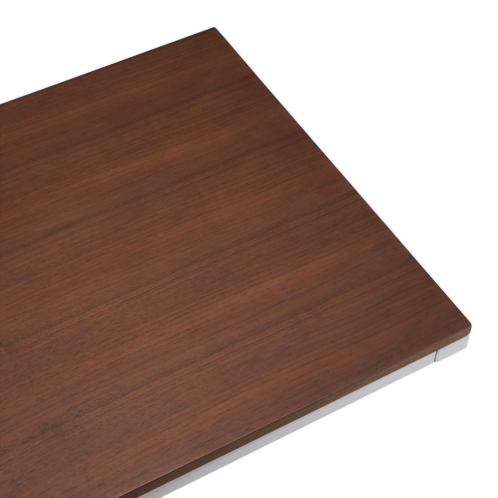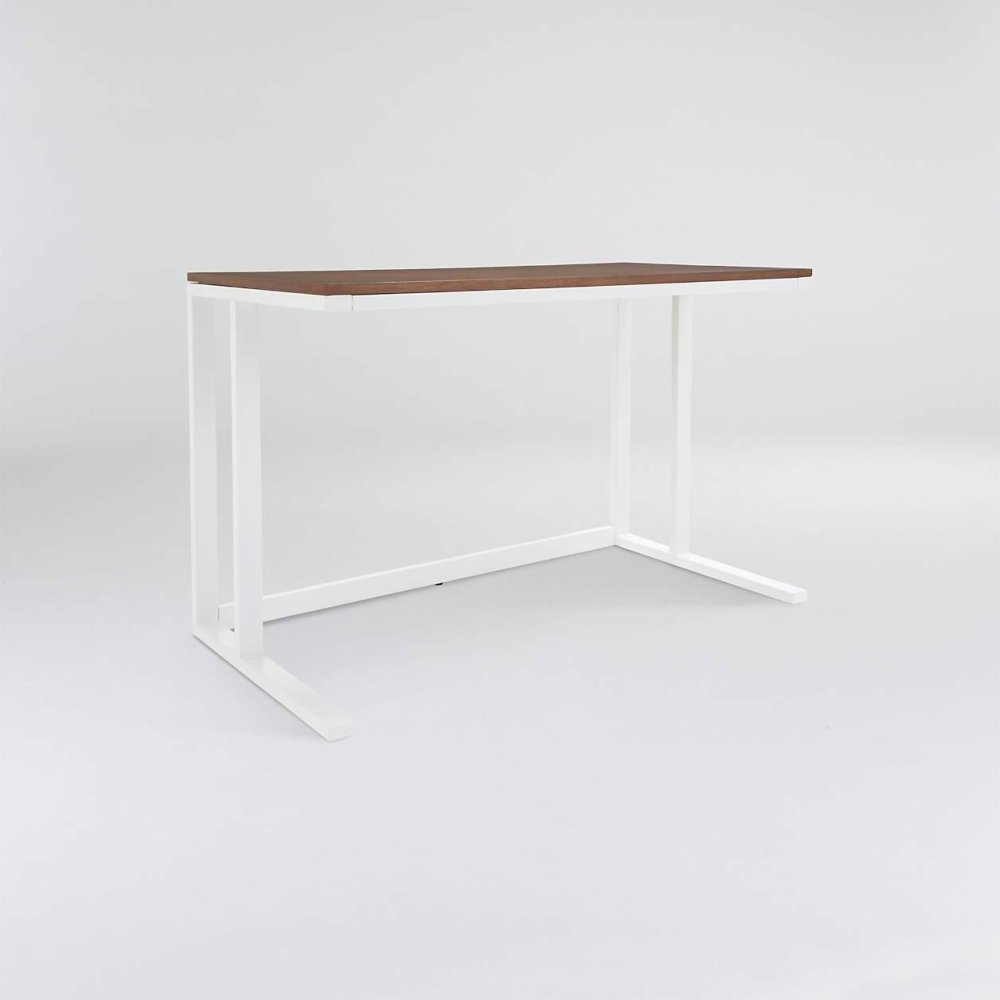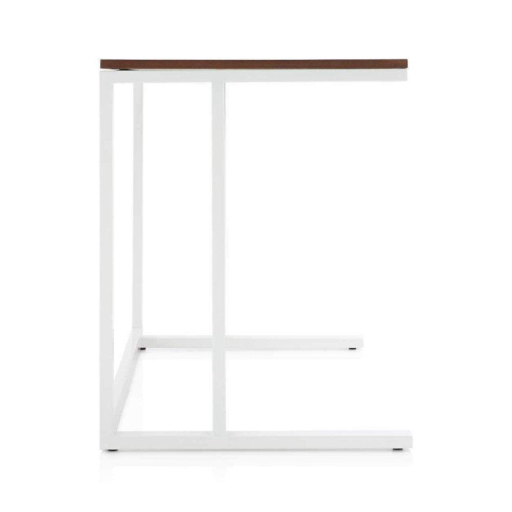 A warm walnut veneer desktop floats over a minimalist yet durable frame of rectangular iron tubing finished in sleek grey powder coat.